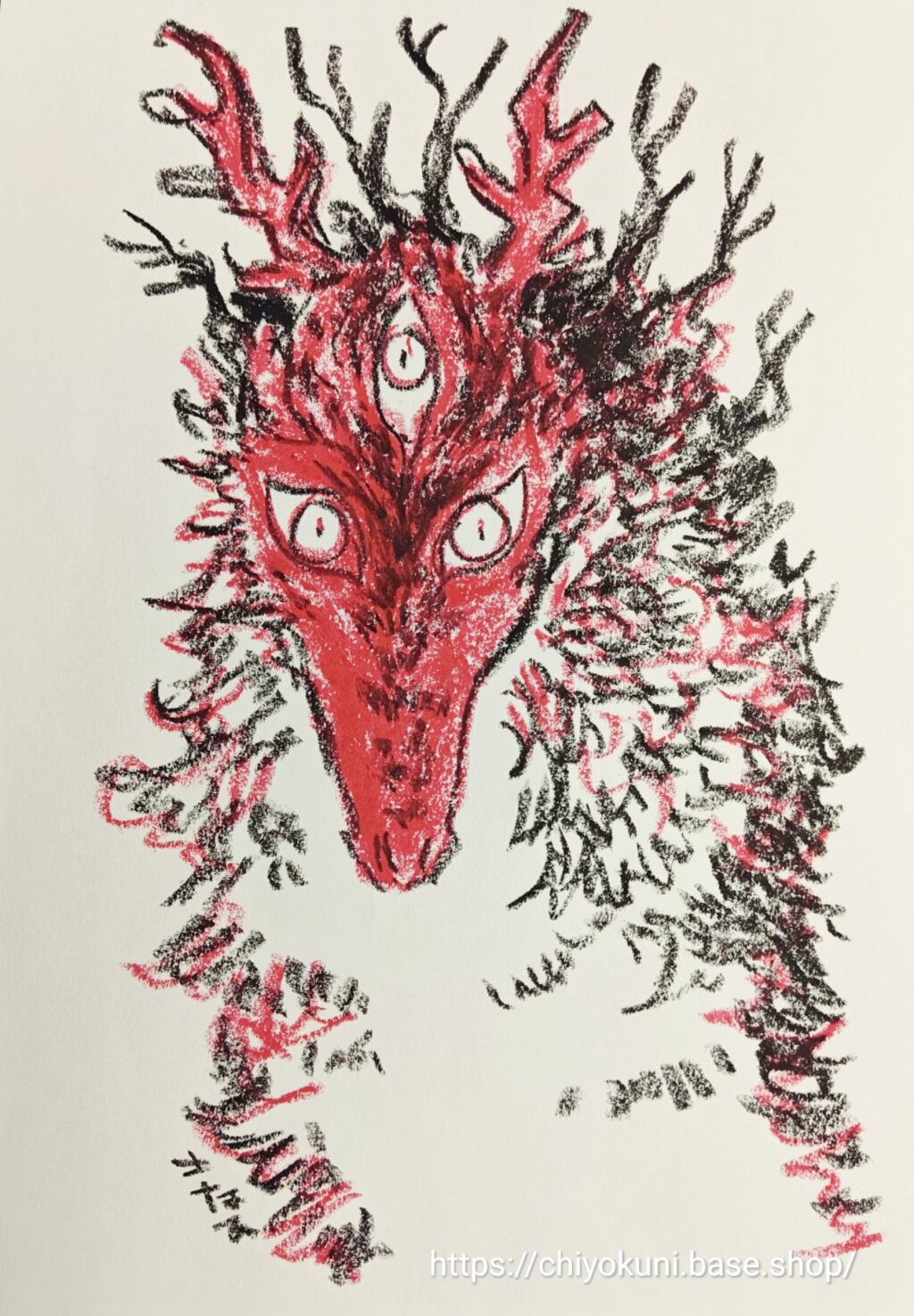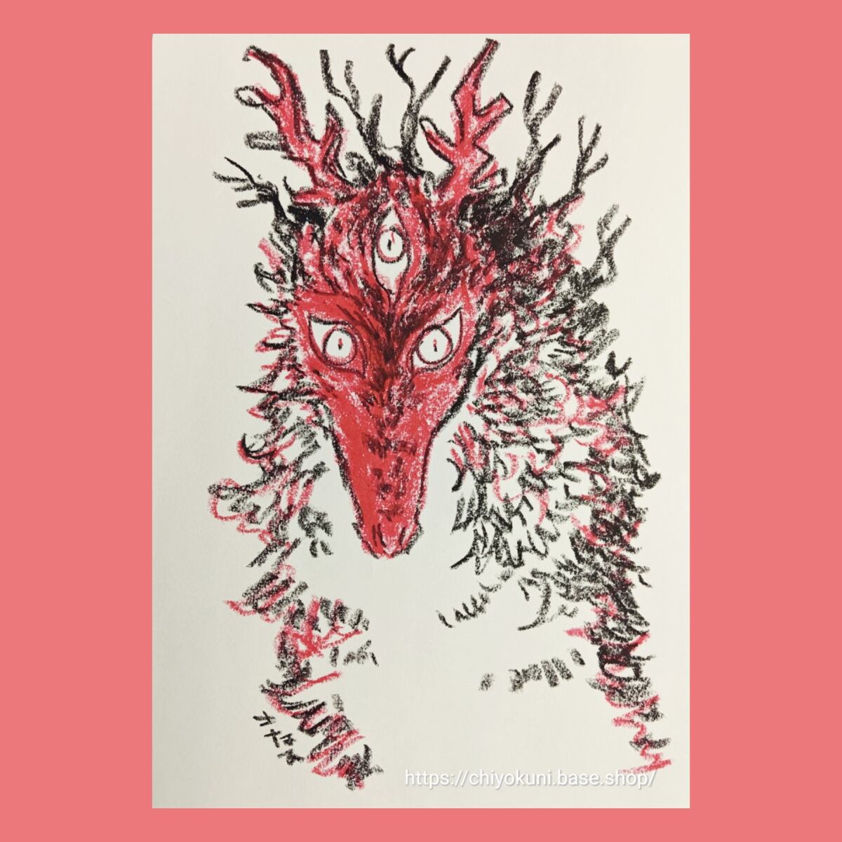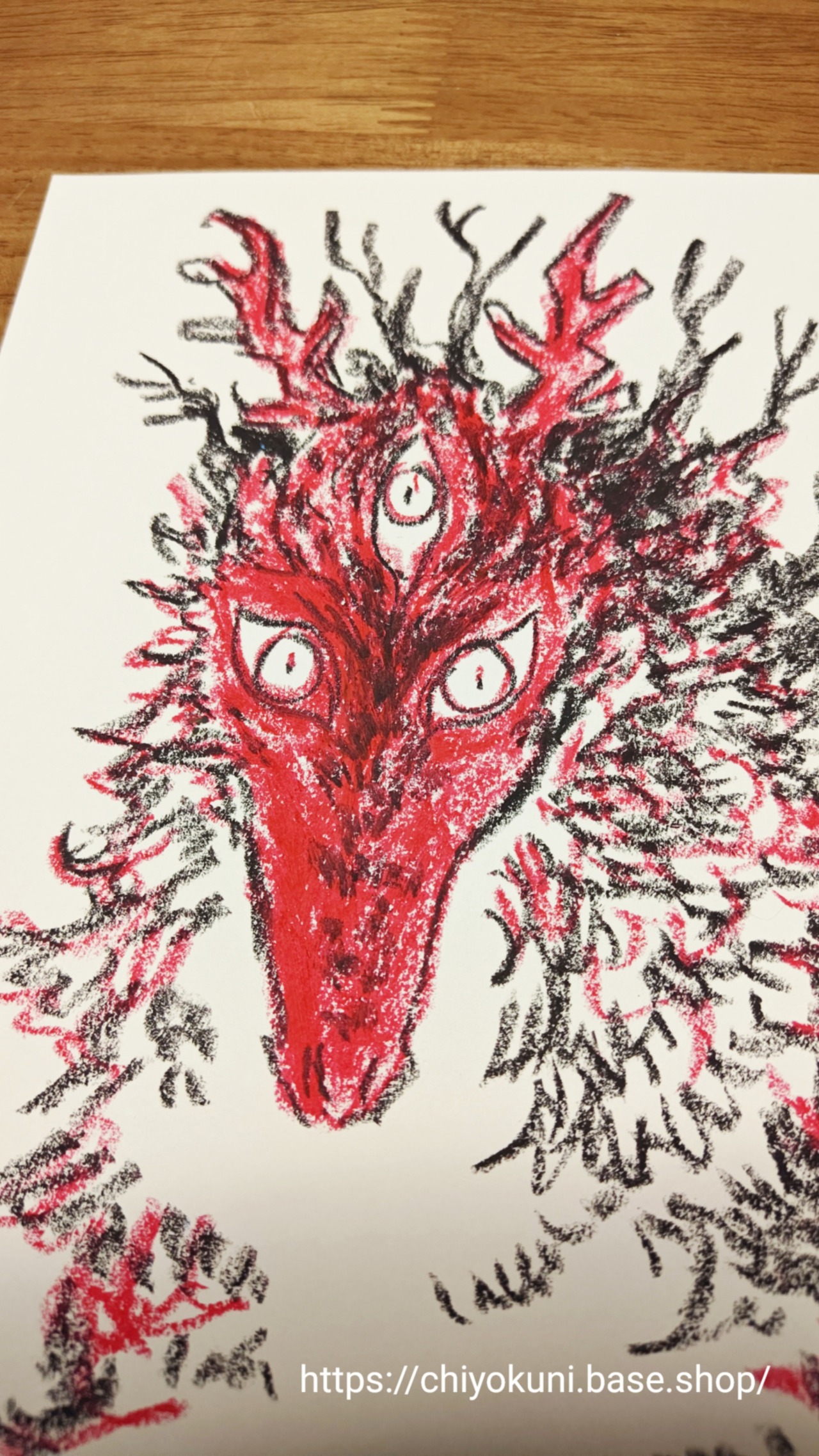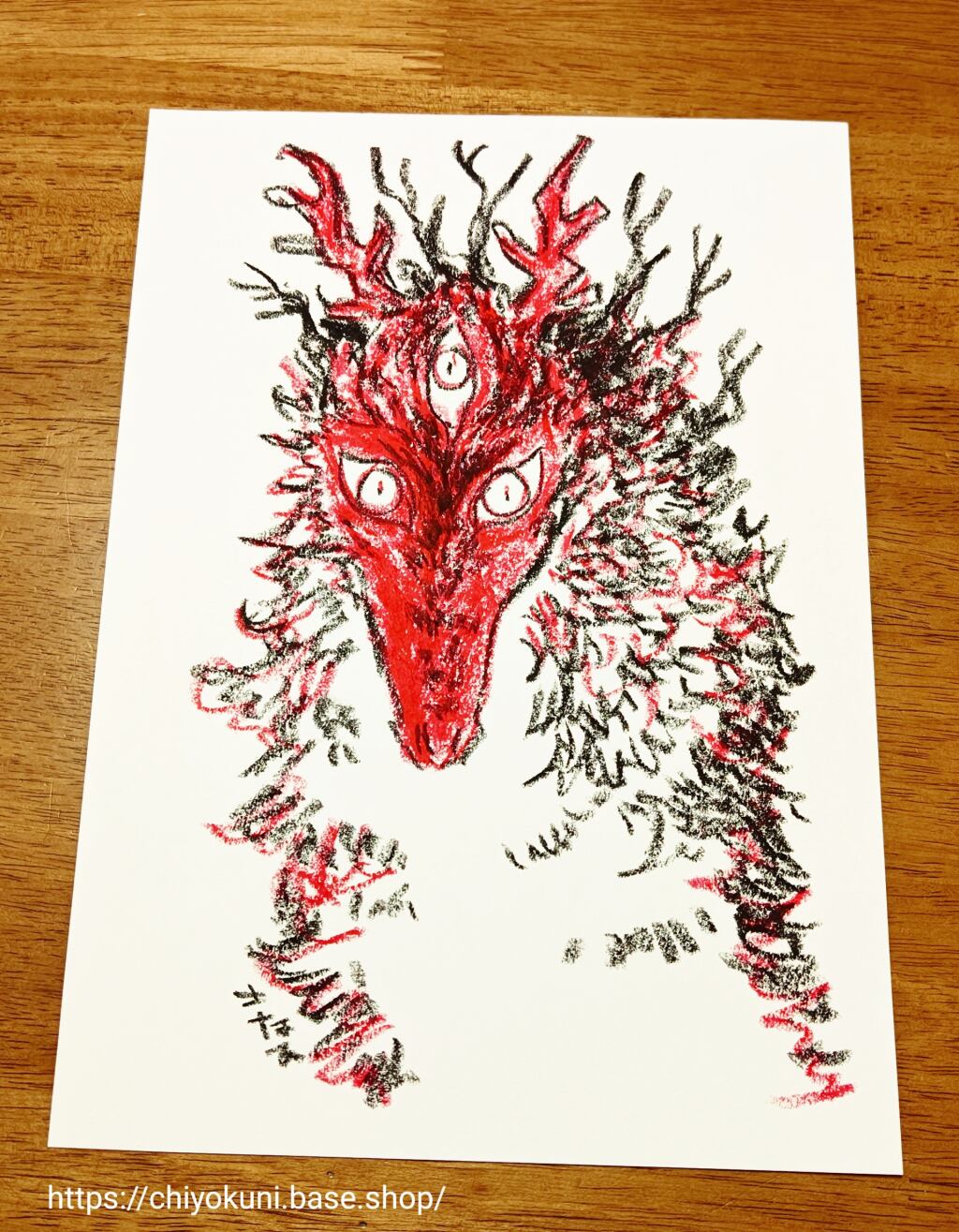 クレヨンで描いた赤い顔の龍さんの絵です。