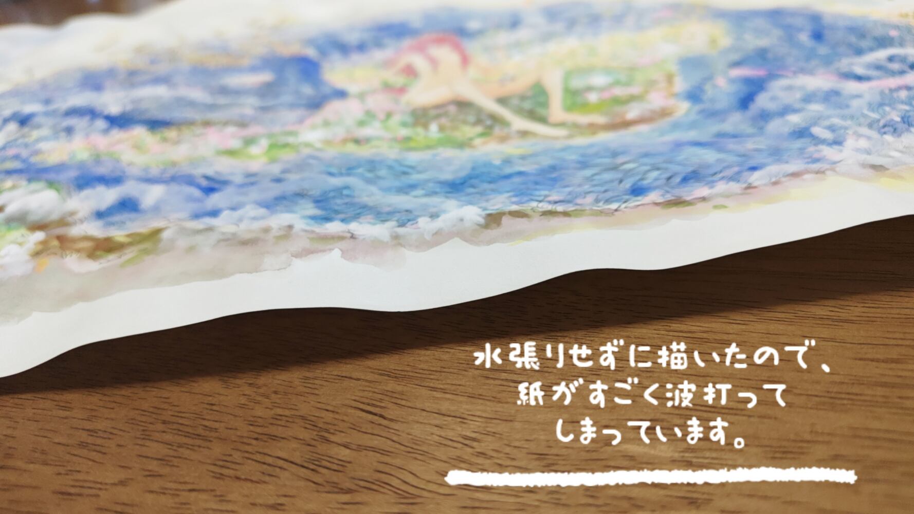 水張りをせずに描いたので、紙がかなり波打っています。