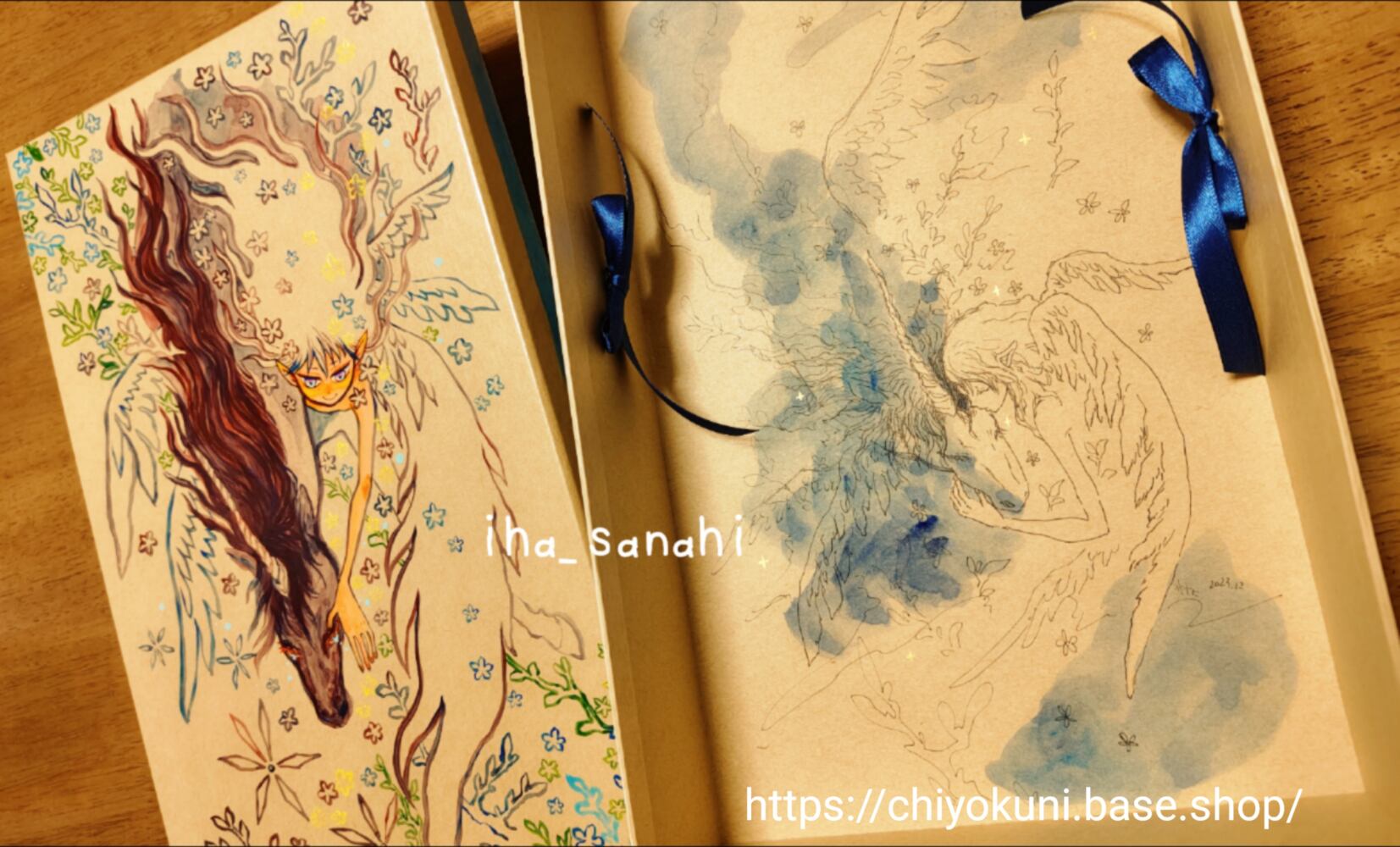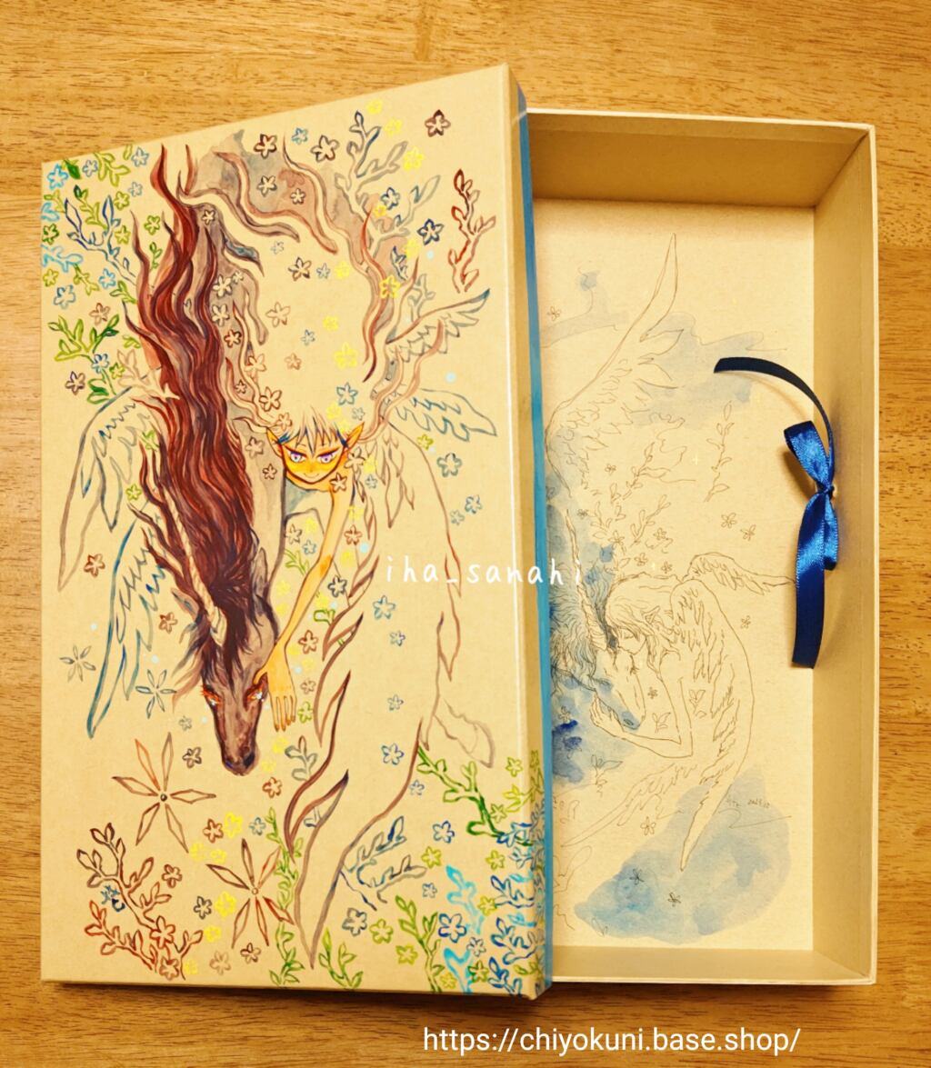 箱の蓋と中にそれぞれ絵を描き、リボンをかけている作品です。
