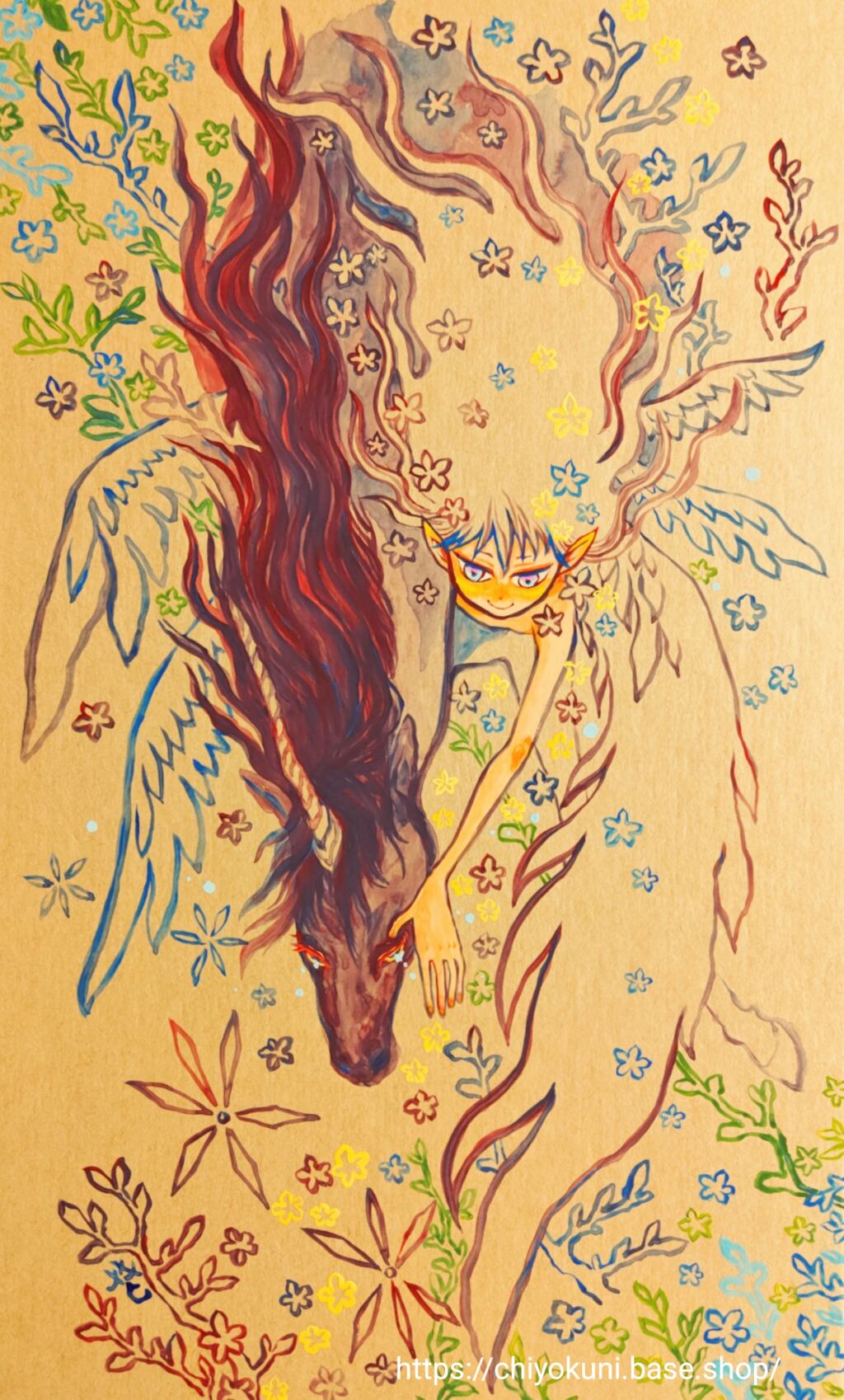 ユニコーンに寄り添う天使さんの絵を描きました。